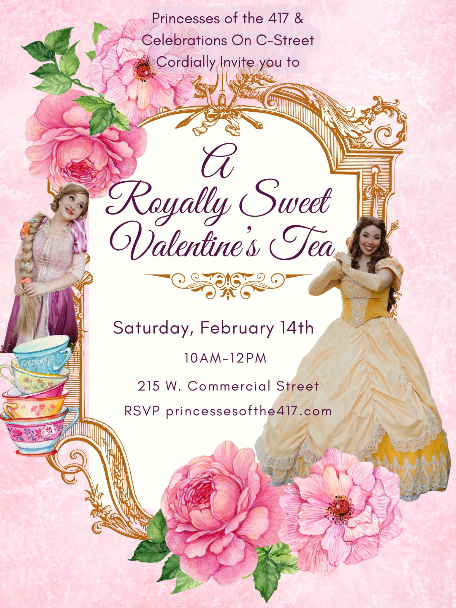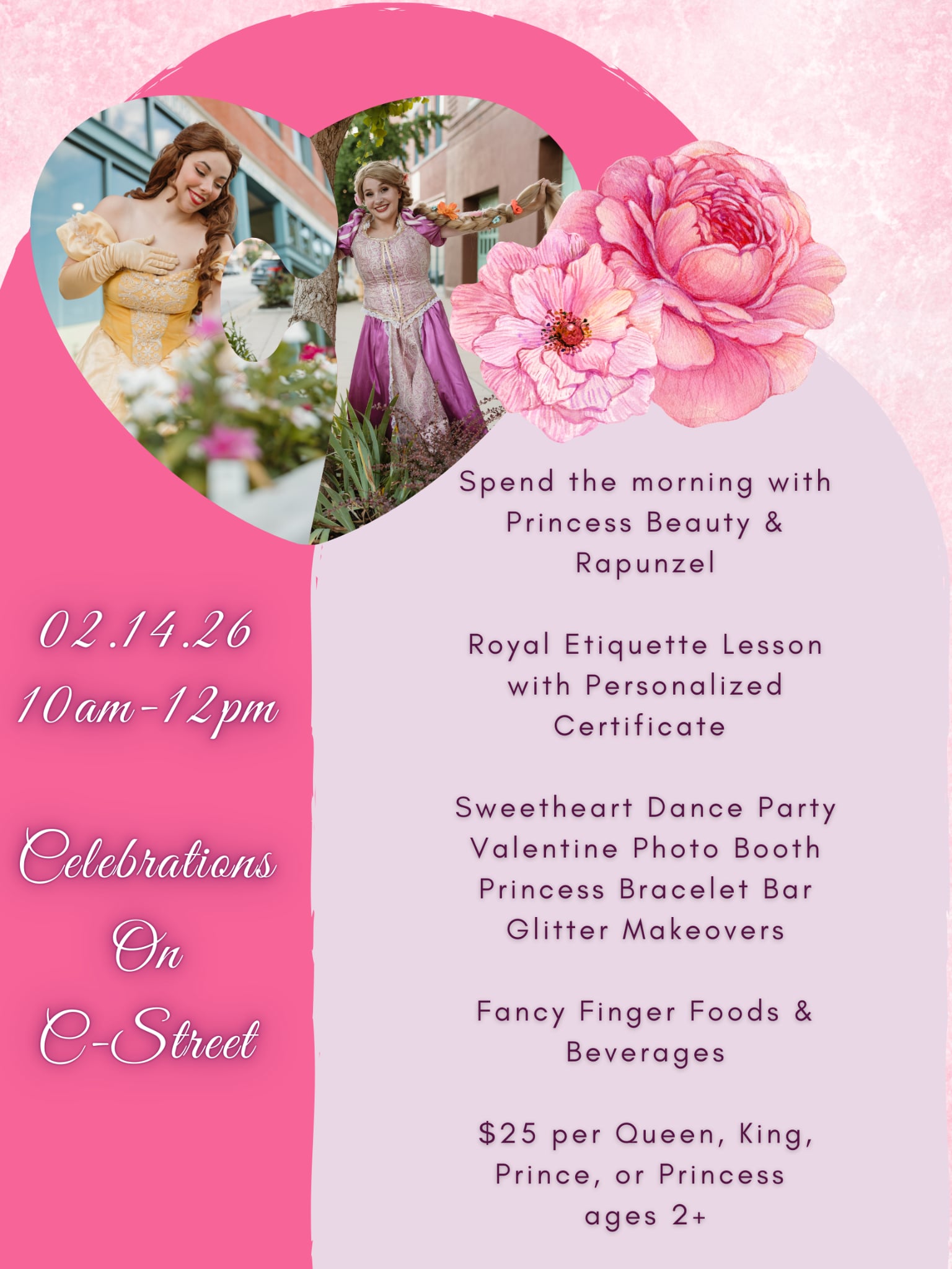 This special event takes place on Saturday, February 14th from 10:00 AM–12:00 PM at Celebrations On C-Street, located at 215 W. Commercial Street. Guests will enjoy princess-led activities, a royal etiquette lesson, fun photo moments, and delightful finger foods in a warm, welcoming setting designed for young hearts.